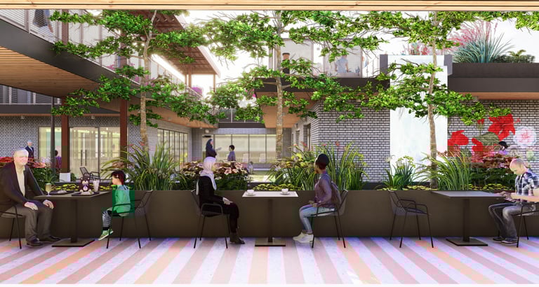 Our goal was to explore the relationship between Ethics and Aesthetics, based on local social and economic conditions, with the aspiration to bring a dignifying design to ALL. To bring this vision to life, we chose an existing mid-century modern building from the 1960s and transformed it into a vibrant commercial complex that celebrates the beauty of preservation while meeting contemporary needs.