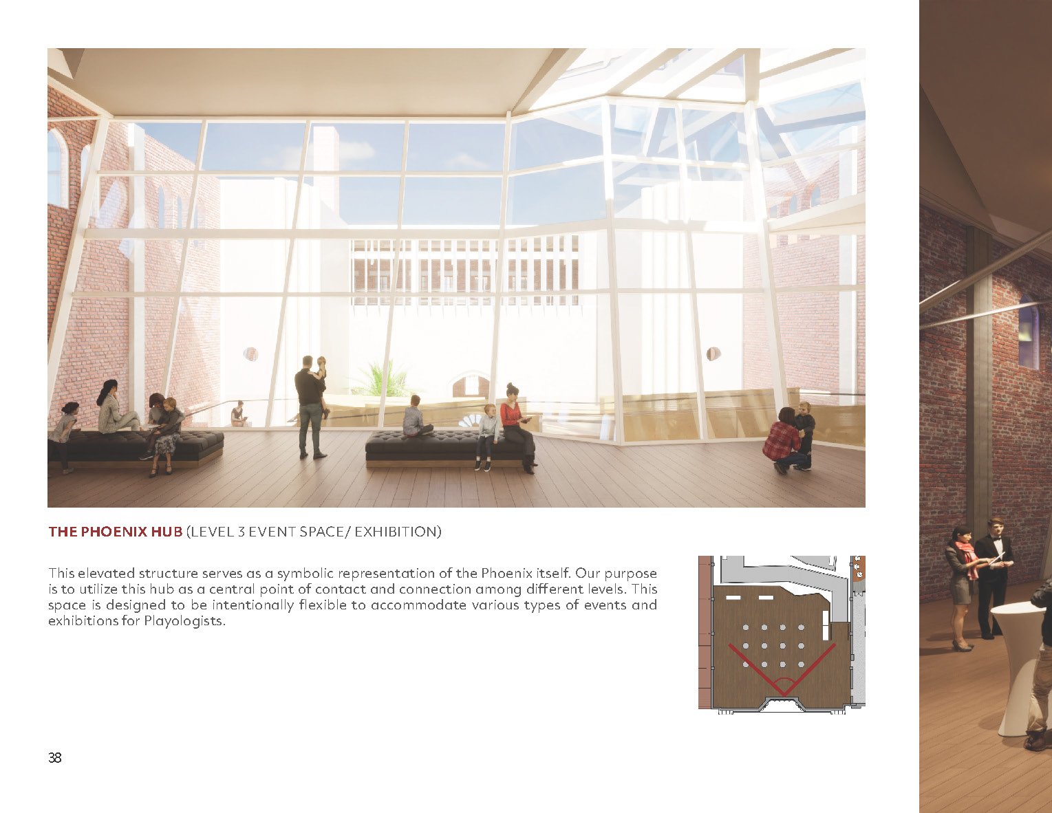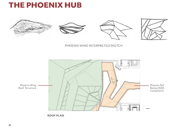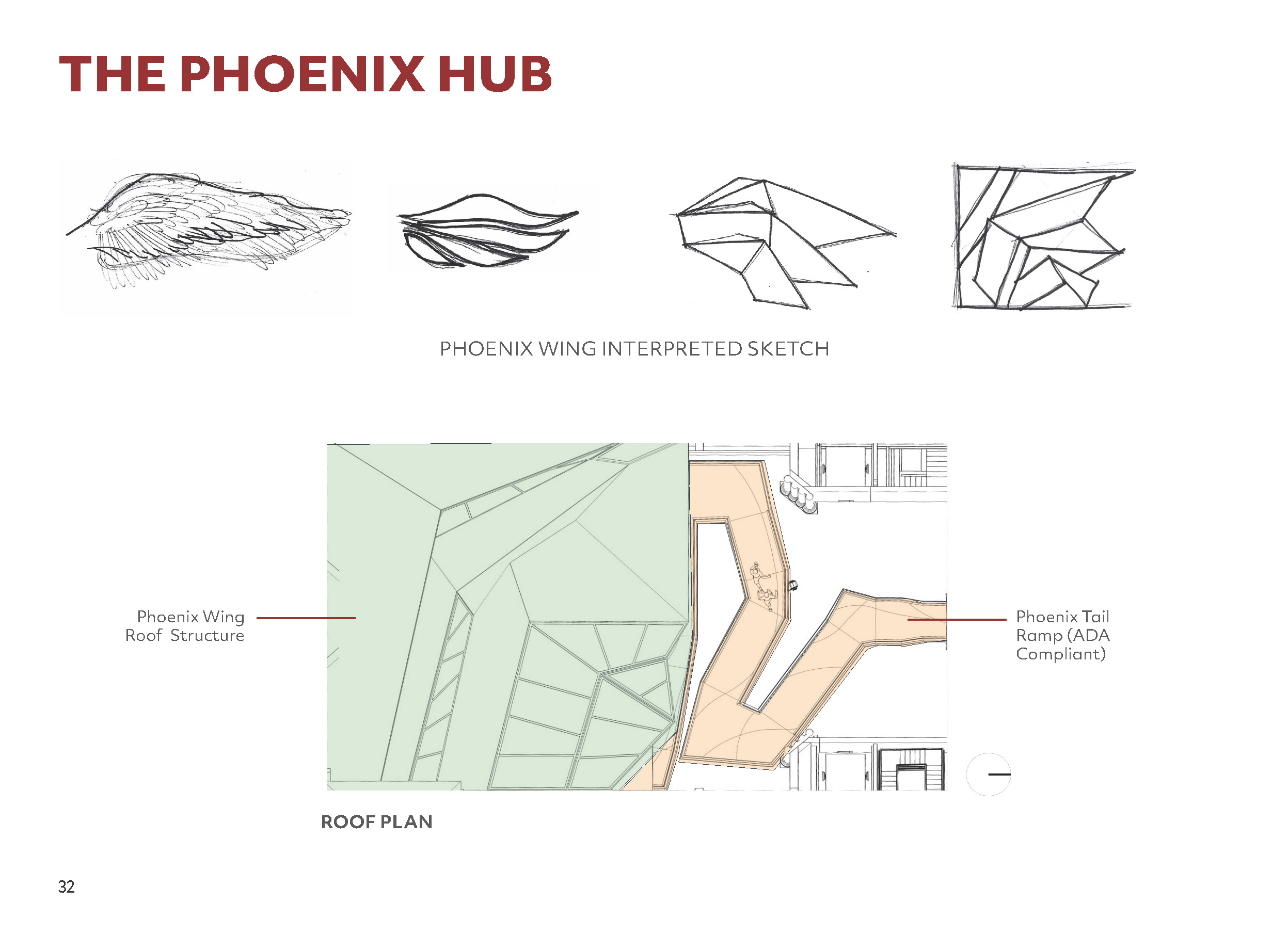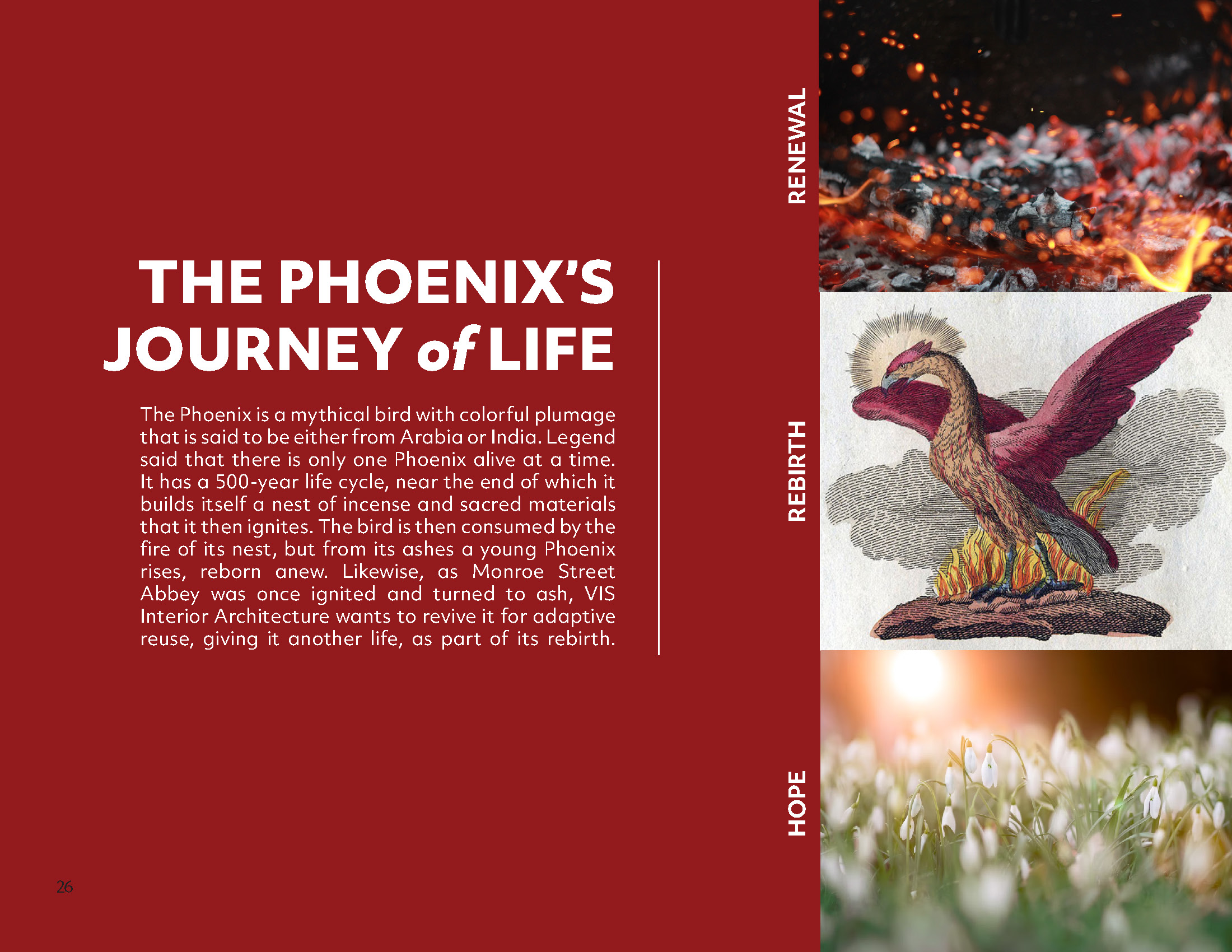 The Phoenix is a mythical bird with colorful plumage that is said to be either from Arabia or India. Legend said that there is only one Phoenix alive at a time. It has a 500-year life cycle, near the end of which it builds itself a nest of incense and sacred materials that it then ignites. The bird is then consumed by the fire of its nest, but from its ashes a young Phoenix rises, reborn anew. Likewise, as Monroe Street Abbey was once ignited and turned to ash, VIS Interior Architecture wants to revive it for adaptive reuse, giving it another life, as part of its rebirth.